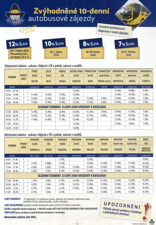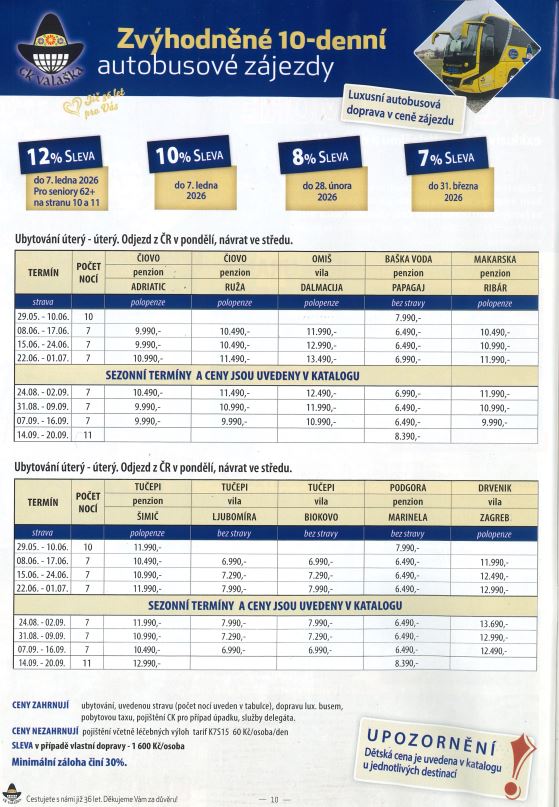 Nabízíme letecké i autobusové zájezdy pro naše partnerské CK: Valaška, Vsacan, Emma a Travel 2002, Victoria, Ancora, Bonton. Nejoblíbenější destinace jsou Řecko, Bulharsko, Turecko, Španělsko, Chorvatsko, Egypt a další.